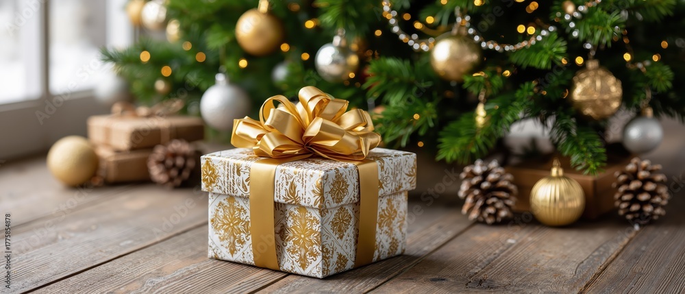 Beautifully wrapped golden ribbon gift box under a decorated christmas tree with ornaments and pinecones on wooden floor #1775854878