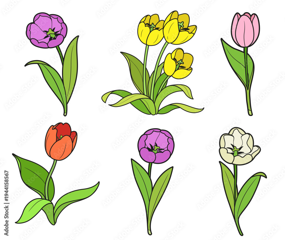 Big blossoming tulip flowers set for coloring book color drawing isolated on white background #1944158567