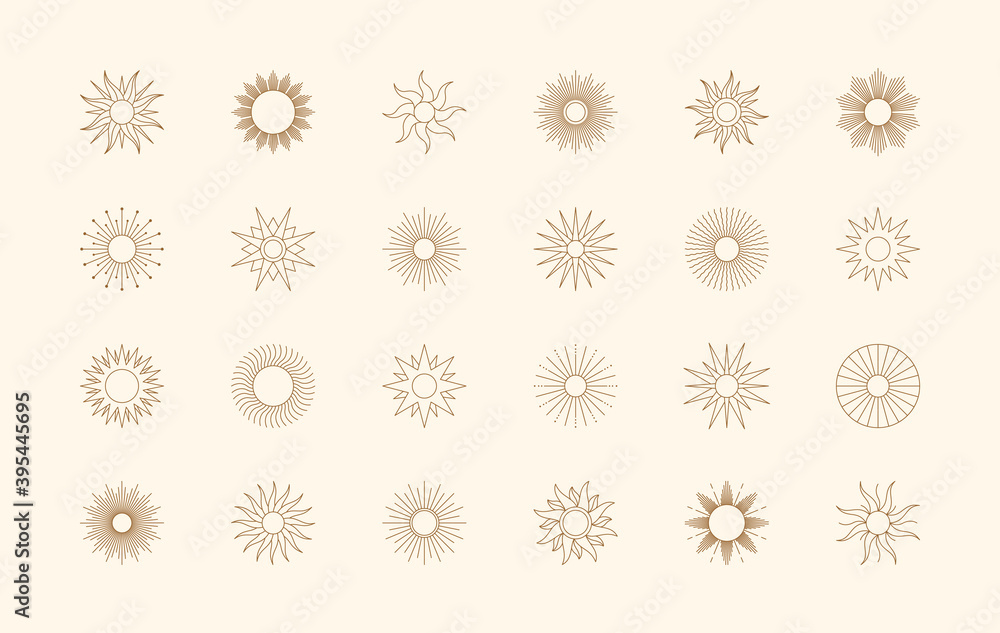 Big set of Sun shapes and Sunburst in minimal trendy style. Vector Icon, logo, labels, badges isolated. Boho illustration for t-shirts print, wall art, creating patterns #395445695