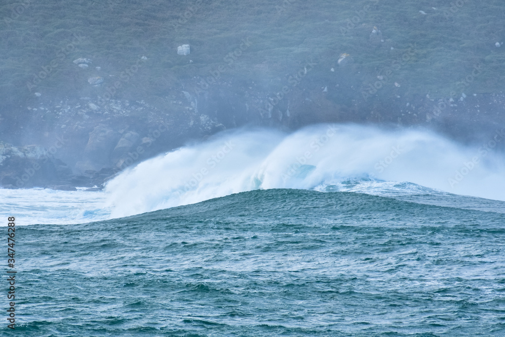 Big waves hit the rocks in rough seas. On a cloudy day. Galicia Spain. #347476288