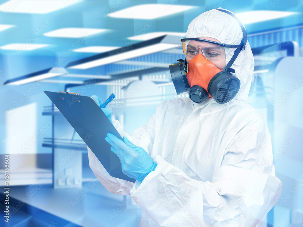 Biotechnology. Scientist in protective suit and respirator writing notes in laboratory, safety, research, virology, epidemic, hazardous materials, medicine. #1731158604