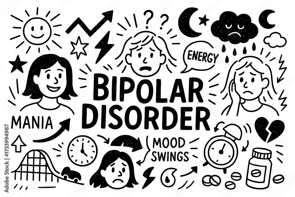 bipolar disorder concept with mania, depression and mood swings doodle icons, Transparent Background #1733994987