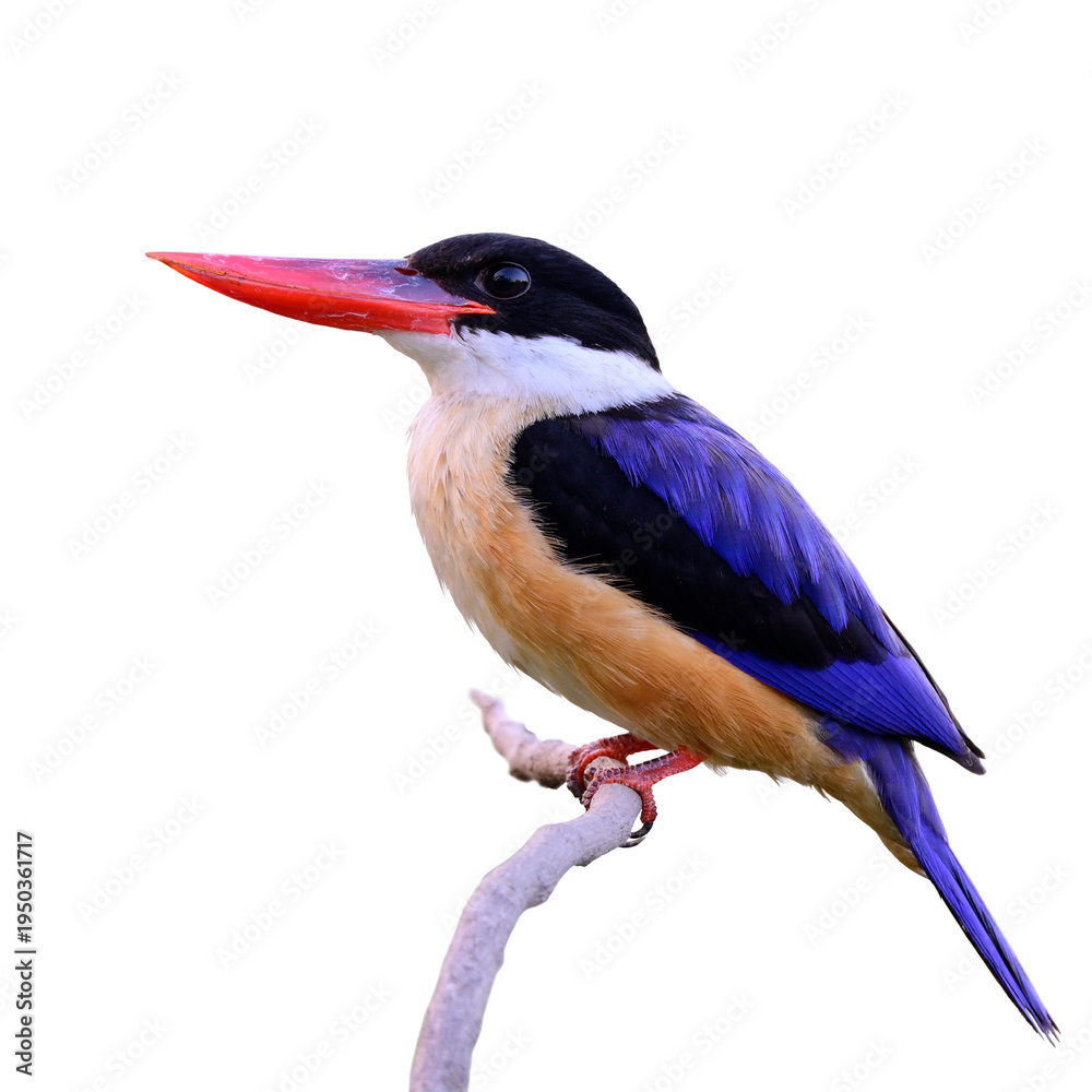 bird isolated on white background, blue bird with red bills looking up alerting to invading enemy, black-capped kingfisher; halcyon pileata #1950361717
