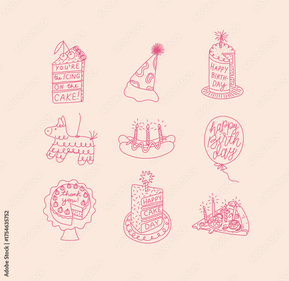 Birthday party elements with the inscription cake, hat, piñata, hot dog, balloon, pizza, dessert drawing with pink on beige background. #1754635752