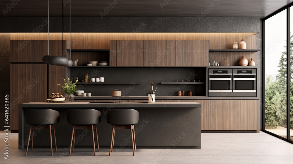 black and dark wooden colour kitchen builtin furniture home interior design background kitchen design with stylish colour and material scheme decorating kitchen in daylight,ai generate #641620365