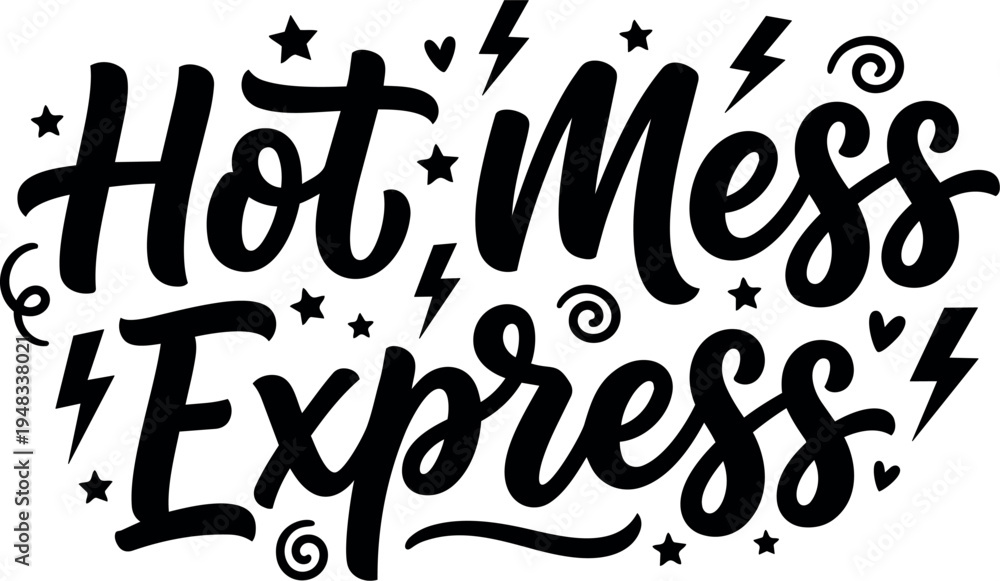 Black and white hand lettering of hot mess express phrase with stars hearts lightning and swirls decorative elements vector art #1948338021