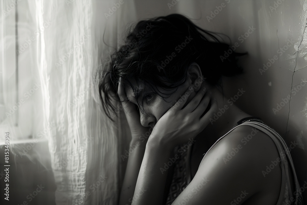 Black and White of Woman Retreating from Reality - Trauma, Mental Illness Concept #815345794