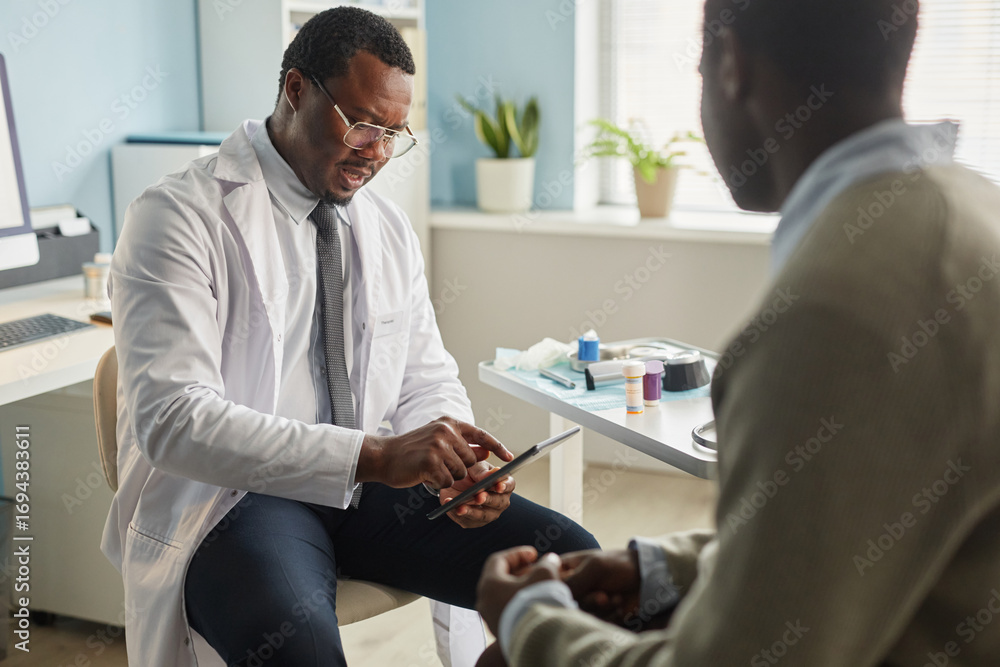 Black middle aged male doctor consulting Black young adult male patient using digital tablet in medical office, both seated and engaged in discussion, healthcare professional explaining diagnosis #1694383611