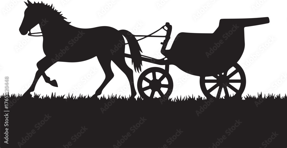 Black silhouette of a horse pulling a carriage on grass #1765820448