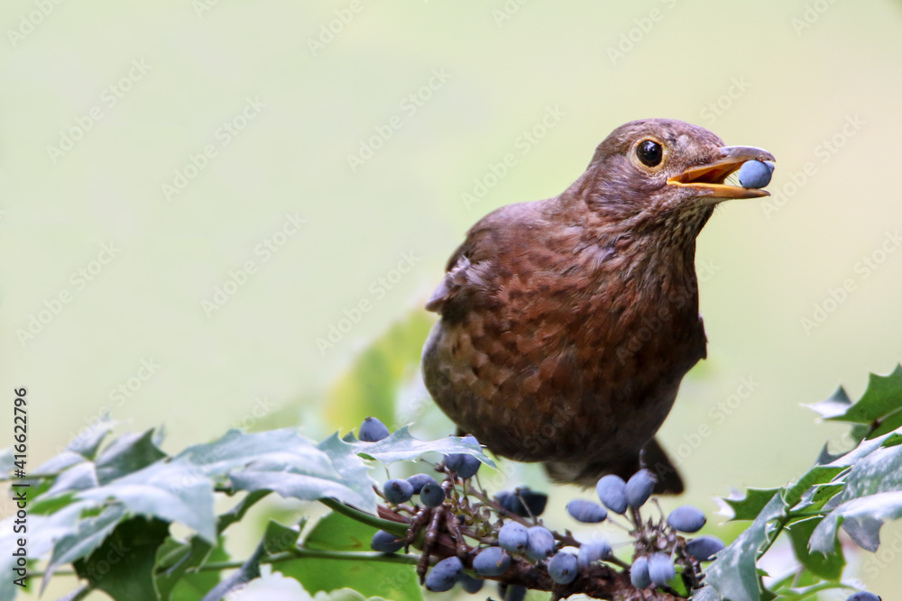Blackbird female bird observing eating berries. Black brown blackbird songbird perched and eating berries fruits on garden with out of focus green bokeh background. Bird wildlife scene. #416622796