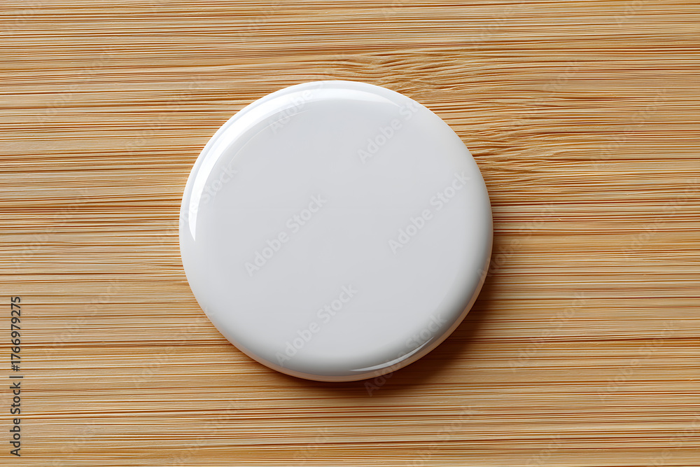 Blank white round pinback button mock up isolated on wooden backdrop #1766979275