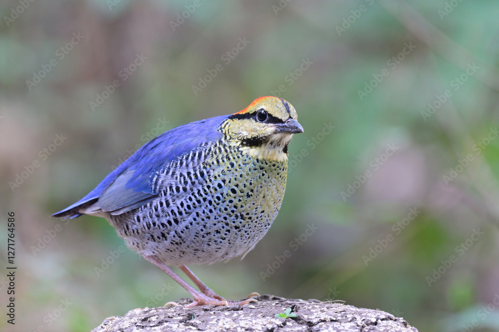 blue bird alerting to invader while protecting its territory, blue pitta, hydronis cyaneus #1271764586