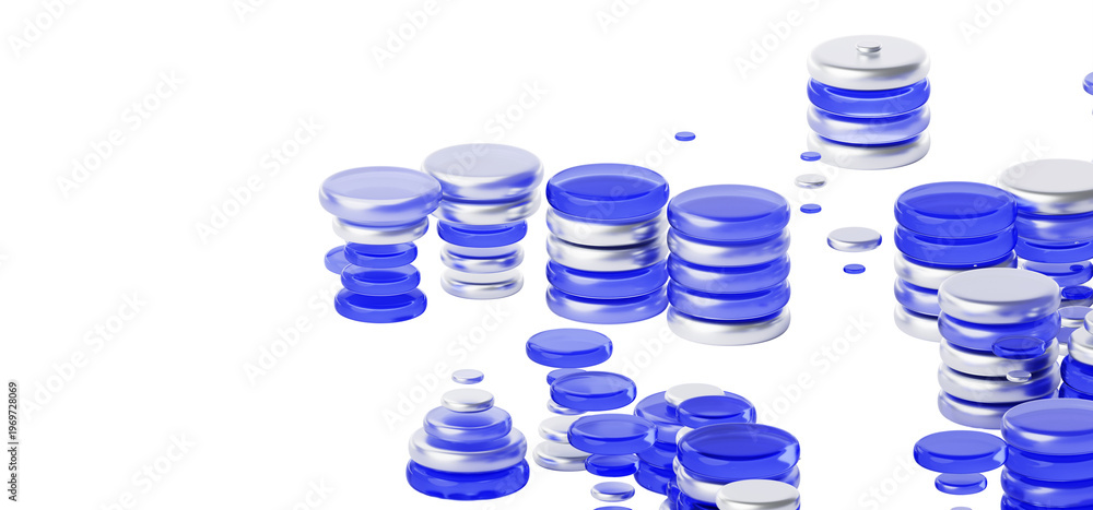 Blue glass and silver metal coin stacks on light gradient 3d background. Floating currency piles, money tokens for casino. Abstract futuristic tech banner with circle geometric shapes #1969728069