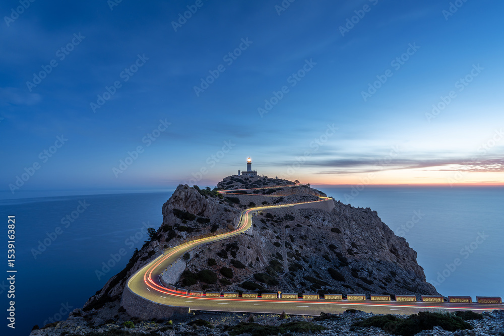 Blue hour image of light trails on winding hairpin road, leading to the Far the Formentor lighthouse, positioned on dramatic cliff landscape next to the ocean on Mallorca, Spain #1539163821
