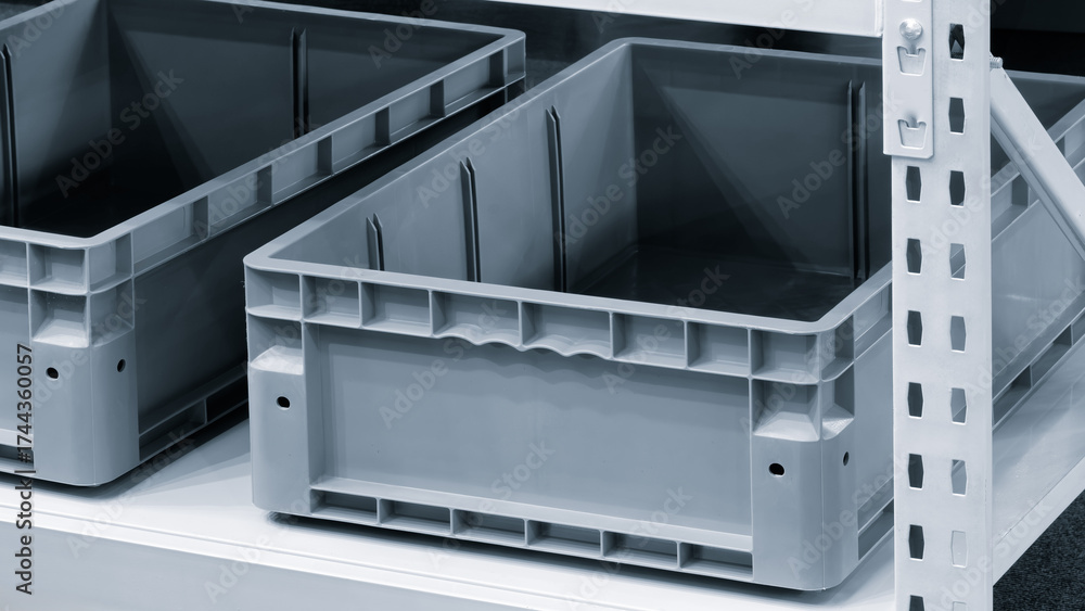 Blue plastic containers on shelf rack in logistics distribution warehouse storage, storage logistics delivery concept background #1744360057