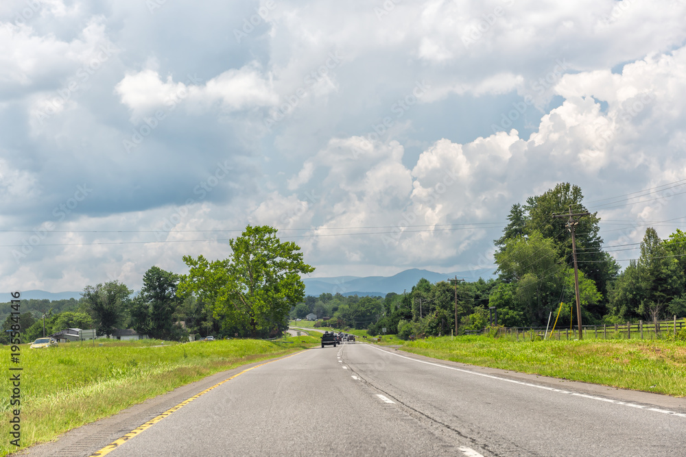 Blue ridge mountains by Virginia US South 29 highway road, cars driving in summer rural countryside village town with scenic landscape #1955841416
