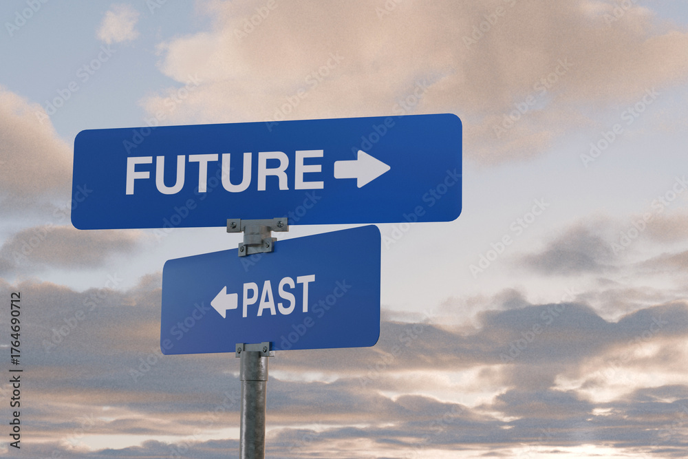 Blue road signs showing “Future” and “Past” with arrows pointing in opposite directions, symbolizing choice, time, progress, decision-making, and moving forward in life. #1764690712