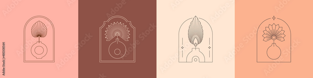 Boho Logos with Vases and Palm Dried Leaves in Modern Minimalist Liner Style. Vector Bohemian Frames #480308564