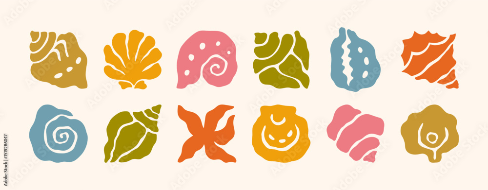Boho Summer Seashells Icons in Retro Style. Groovy Geometric Shells, Sea Star, Snail, Scallop. Vector Abstract Square Tropical Illustration in Freehand for Logo, Patterns, T-Shirt Print, Stickers #1519286047