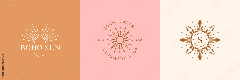 Boho Sun Logo Set in Minimal Liner Trendy Style. Vector Set Bohemian Badges for Creative Studio, Photography, Jewelry, #467841318