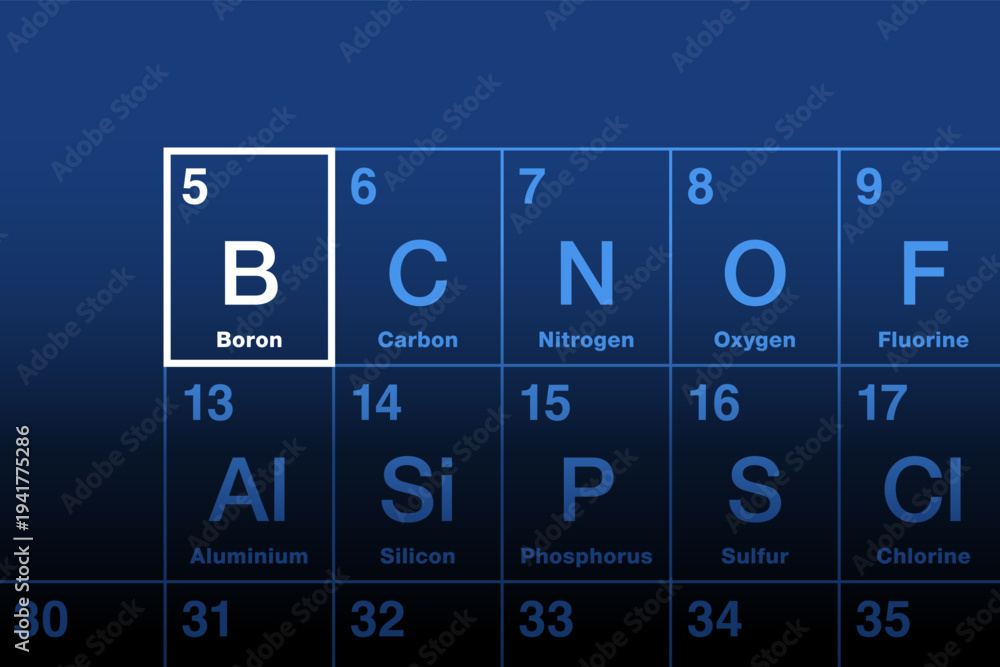Boron, chemical element on periodic table. Metalloid with atomic number 5, and element symbol B, from borax. Used as additive in fiberglass, polymers and ceramics, and for borosilicate glass. Vector #1941775286
