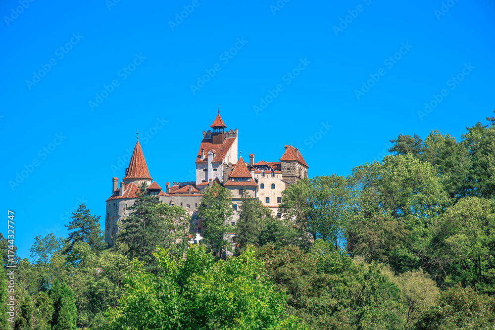 Bran Castle, famous for its connection to Dracula, standing prominently on a forested hillside, attracting tourists to its medieval architecture and historical significance in Romania, Transylvania #1744327747