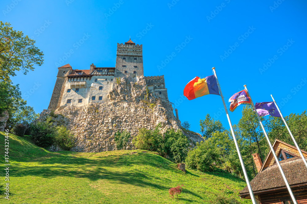 Bran Castle standing on a rocky hill, a medieval fortress and national monument, with Romanian, Brasov County, and European Union flags waving in front under a clear blue sky in Romania, Transylvania #1744327446