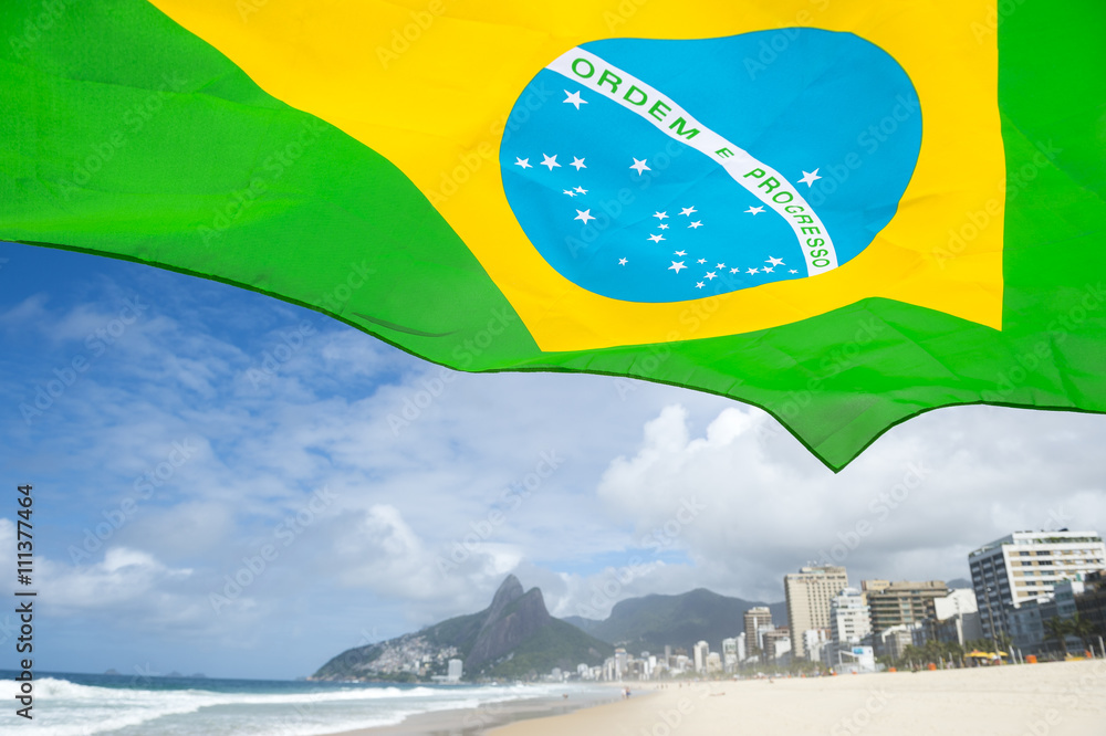 Brazilian flag flying in bright sun above the city skyline at Ipanema Beach in Rio de Janeiro, Brazil #111377464