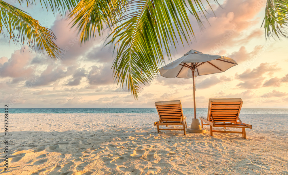 Breathtaking panoramic romantic beach sunset with elegant white sunbeds and umbrella, palm leaves framing calm ocean, dreamy relaxing tropical landscape stunning summer honeymoon vacation background #1973728002