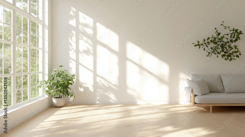 bright and airy living room featuring large window, soft sofa, and potted plant, creating serene atmosphere with natural light and shadows #1352042186