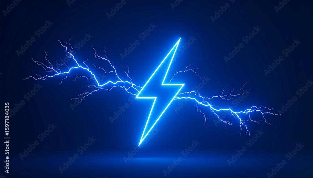 Bright blue neon lightning bolt symbol with electric energy sparks power electricity #1597184035