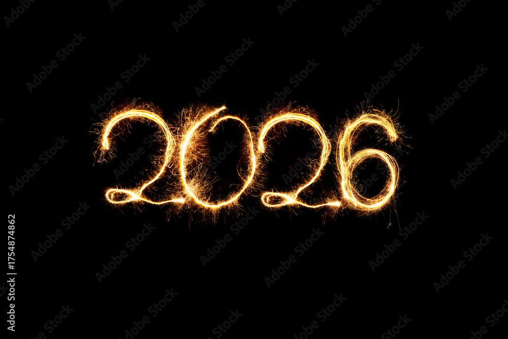 Bright sparkling “2026” written with golden light on a black background, symbolizing New Year celebration, fireworks, and festive spirit. Perfect for holiday and countdown themes. #1754874862