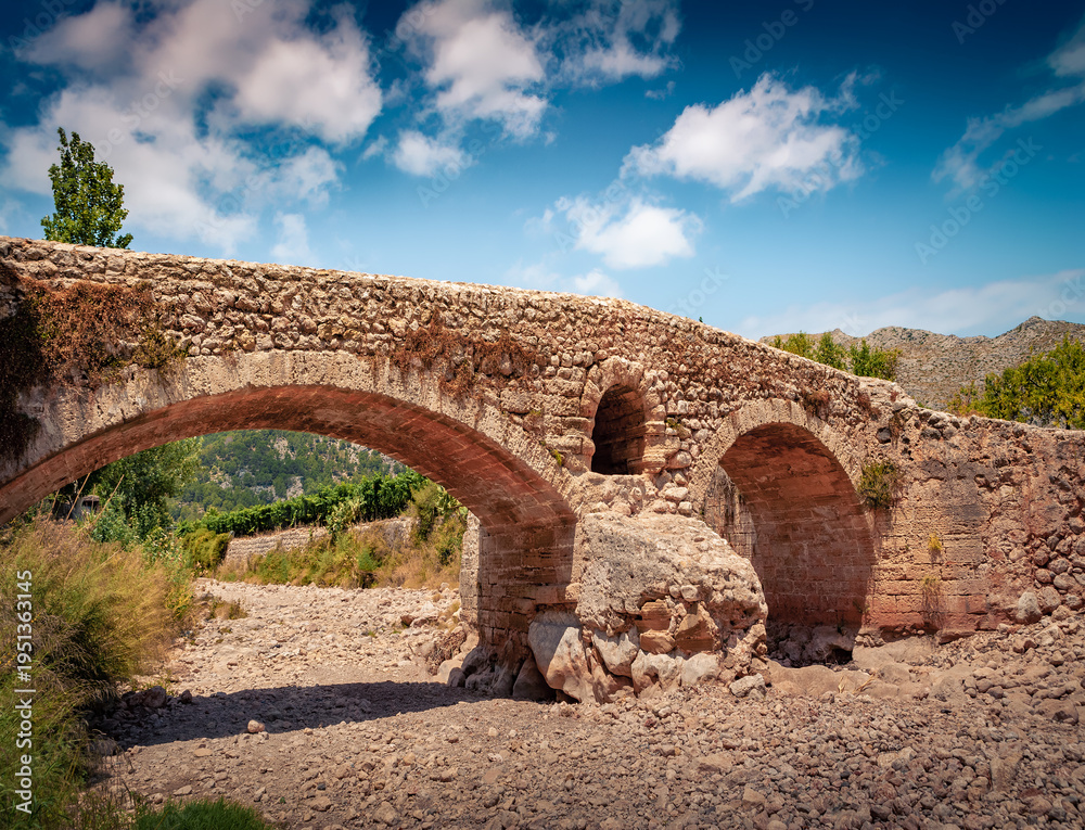 Bright summer view of Roman bridge across the Torrent de Sant Jordi river. Splendid morning scene of Pollenca cityscape, Majorca, Balearic islands, Spain, Europe. Traveling concept background. #1951363145