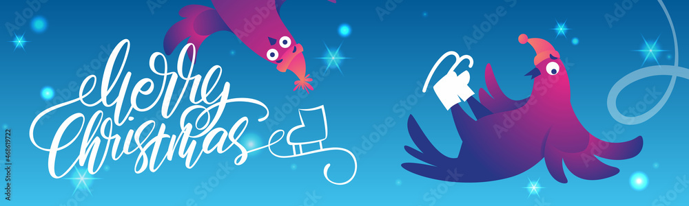 Bright Xmas web banner with funny pigeons. Handwritten lettering Merry Christmas. Funny characters doves in skates. Pigeons are skating on the ice rink. Holiday vector illustration. #468619722