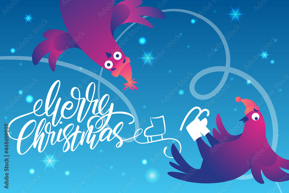 Bright Xmas web banner with funny pigeons. Handwritten lettering Merry Christmas. Funny characters doves in skates. Pigeons are skating on the ice rink. Holiday vector illustration. #468619807