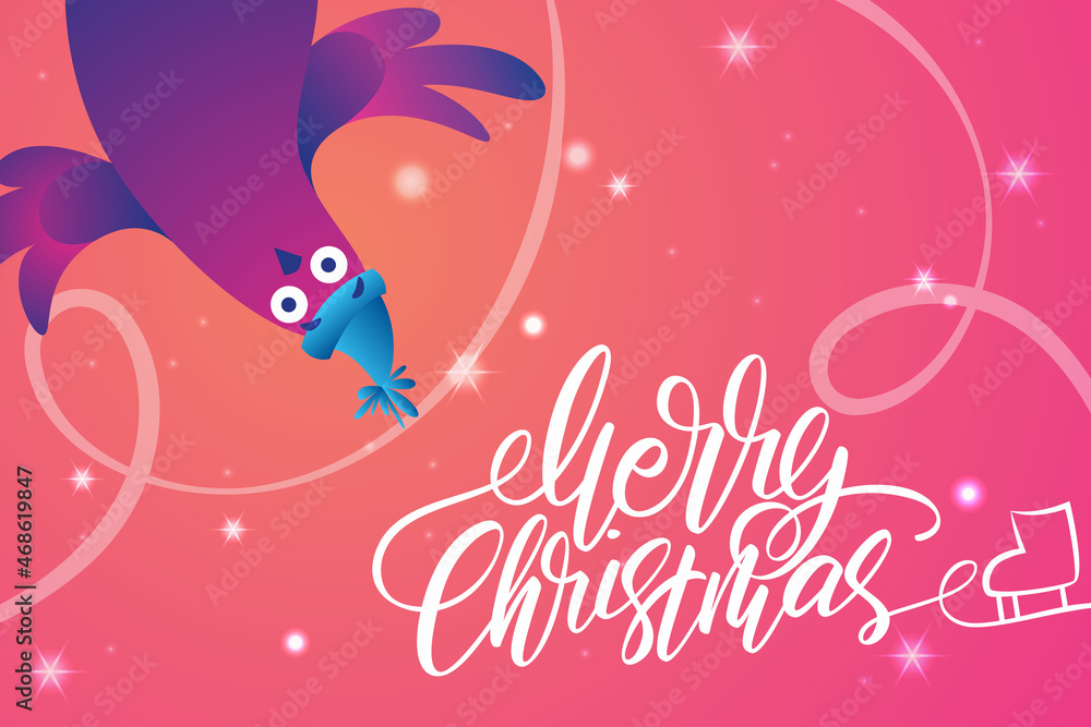 Bright Xmas web banner with funny pigeons. Handwritten lettering Merry Christmas. Funny characters doves in skates. Pigeons are skating on the ice rink. Holiday vector illustration. #468619847