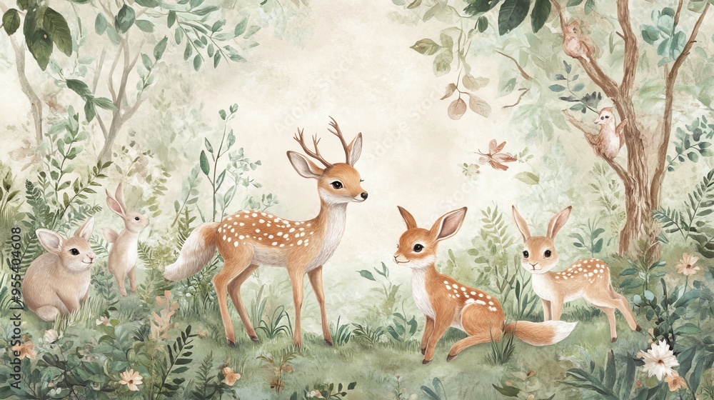 Bring the magic of the forest into your child's room with this enchanting wallpaper mural. Featuring adorable animals like deer, foxes, and bunnies frolicking amidst lush greenery #955404608