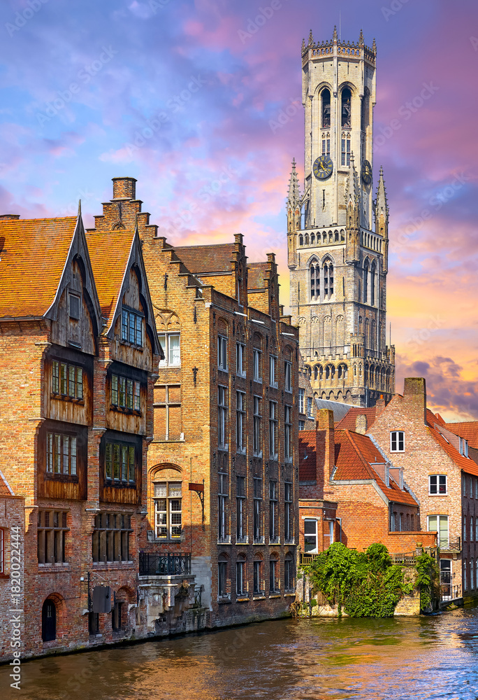 Bruges, Belgium. View at medieval bell tower Belfort van Brugge in old town. Vintage houses on canals. Old Europe landscape, popular travel destination. #1820022444