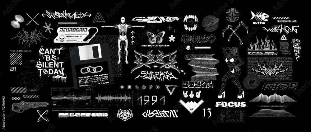 Brutalism graphic box, universal fashion and futurism elements for techwear label, retrofuturistic and brutalism aesthetics. Y2K vibe, acid rave. Cyberpunk 3D elements with lettering and HUD. Vector s #1729163095