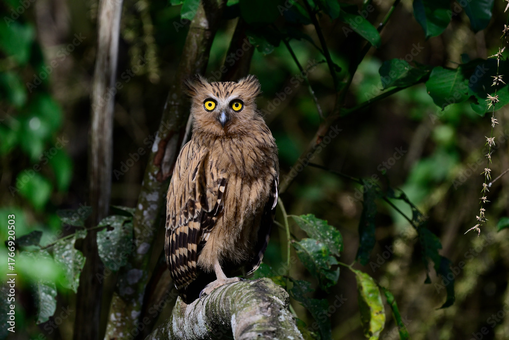 Buffy Fish-Owl, Ketupa ketupu, Large, orange-brown with prominent horns on its head, big eyes day bird in nature #1766920503