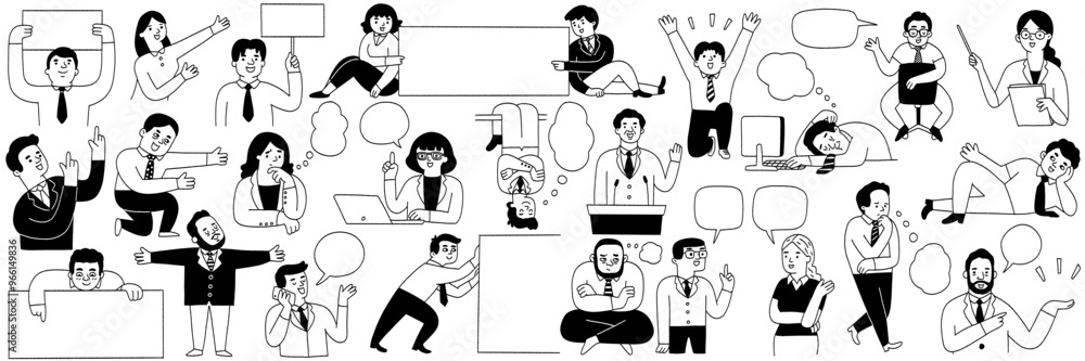 businespeople, man and woman, pointing, presenting with copy space and speech bubbles. Outline, linear, thin line art, black and white ink style. #966149836