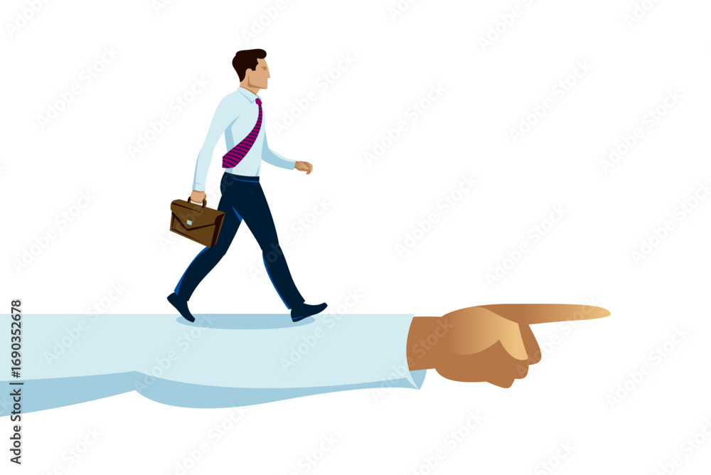 Business man going ahead to his goal with shown direction, vector illustration of a young man business dressed walking straight towards to his aim with hint, career concept. #1690352678