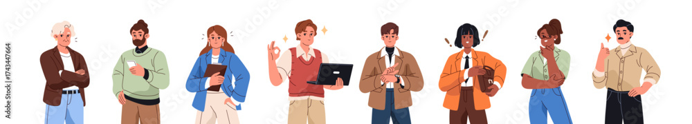 Business people are happy for success set. Businessmen and businesswomen with approval hand gestures. Employees, office workers with thumbs up, OK signs. Flat isolated vector illustrations on white #1743447664