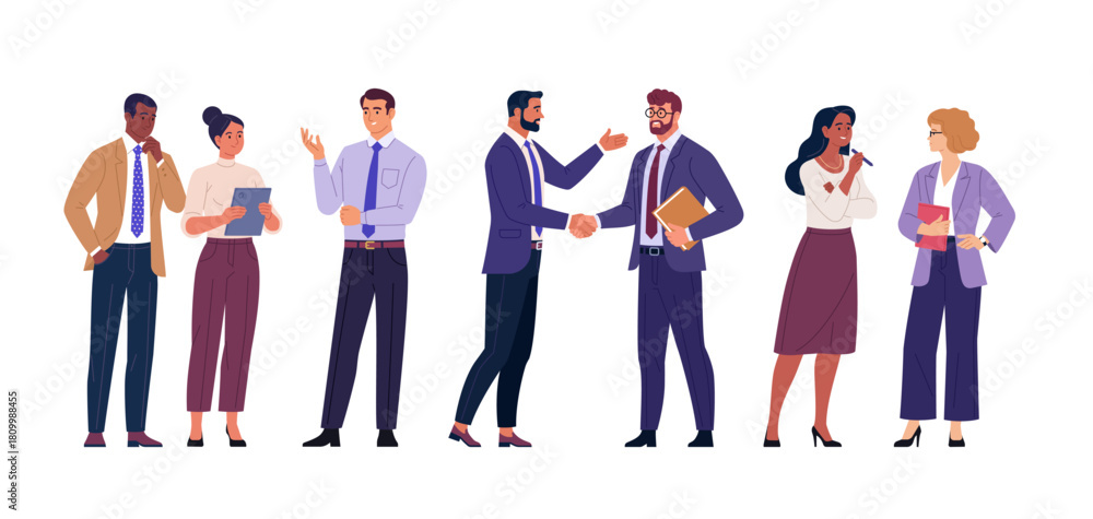 Business Team Collection. Vector cartoon illustration of a group of diverse businesspeople standing together, communicating, shaking hands, and discussing work tasks. Professional office characters. #1809988455