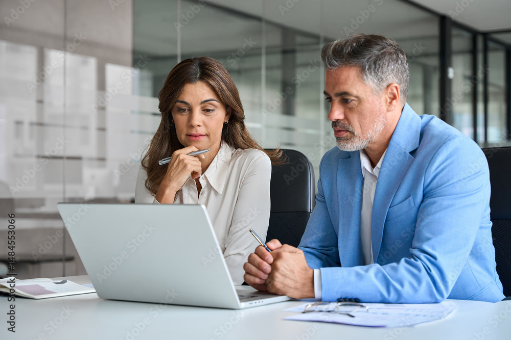 Business team of two busy professionals using laptop thinking on financial investment. Corporate leaders looking at computer at work desk, mid aged executives business man and woman working in office. #1484553066