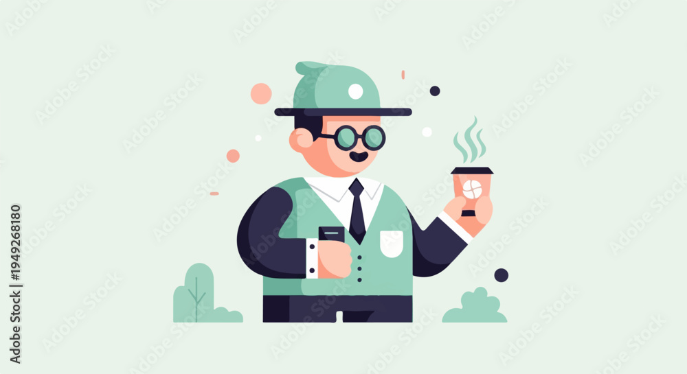 Businessman holding a cup of coffee and a phone, in flat illustration style #1949268180