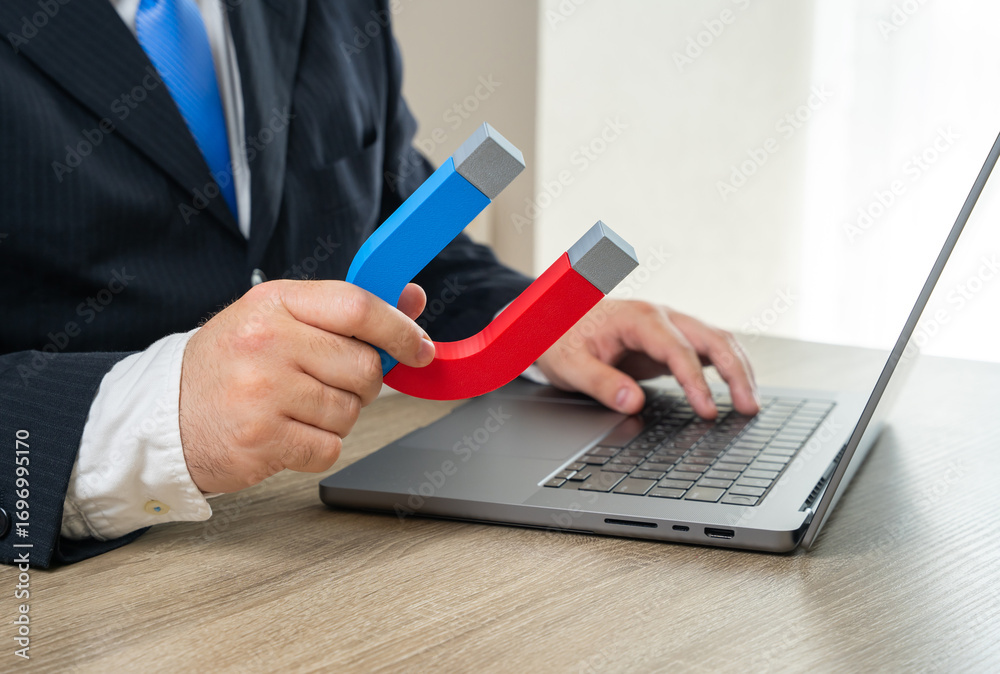 Businessman holds a magnet. Symbol of attracting talent, investments, and new opportunities. Used for HR strategy, finance, sales growth, and positive business outcomes. #1696995170