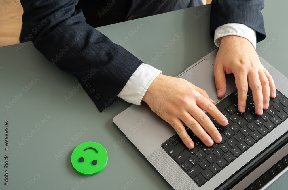 Businessman with laptop and green smiley. Symbol of productivity, motivation, and workplace well-being. Suitable for HR management, business success, and employee satisfaction. #1696995192