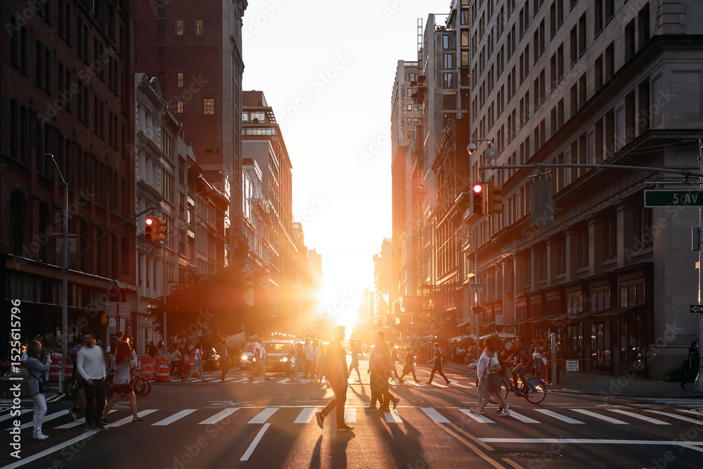 Busy intersection is crowded with people and traffic on 5th Avenue and 23rd Street in New York City with sunlight shining between the background buildings #1525615796