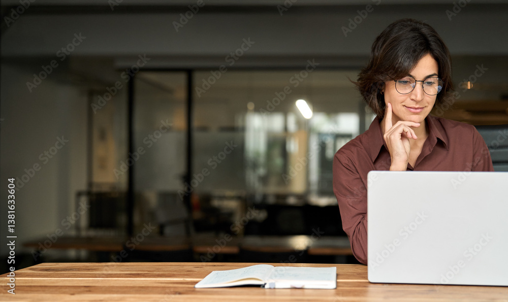 Busy young business woman executive using laptop in office. Hispanic businesswoman company worker sitting at work desk, professional female hr manager looking at pc computer at work. Copy space #1381633604